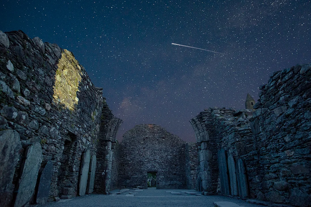 As the night fell, we kept on moving. Half way through the route, the sun had set behind the mountains and we were slowly moving into blue hour. Last 30 minutes of the walk was in complete darkness, but eventually, we made it back to the Upper Glendalough Lake. As it wasn't dark enough yet to take star photos, we decided to walk down to the monastery and waste some time till the stars came out.